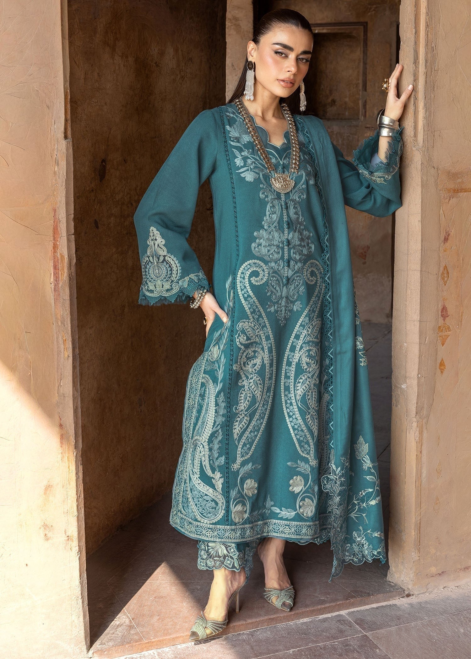 A breathtaking fusion of winter's elegance and artistic craftsmanship, where a rich teal canvas serves as the foundation for an exquisite design. An ode to the classic Kashmiri embroidery. The shirt is adorned with intricate paisleys and floral motifs in a harmonious blend of ivory, Aegean blue, and teal. Each hue thoughtfully selected to evoke the spirit of ethnic culture and timeless artistry. Paired with a luxurious teal woollen shawl, delicately detailed on organza, floral bunch motifs adding a modern twist to a classic masterpiece that transcends fashion. It is a visual symphony of warmth, capturing the essence of winter's elegance and heritage.