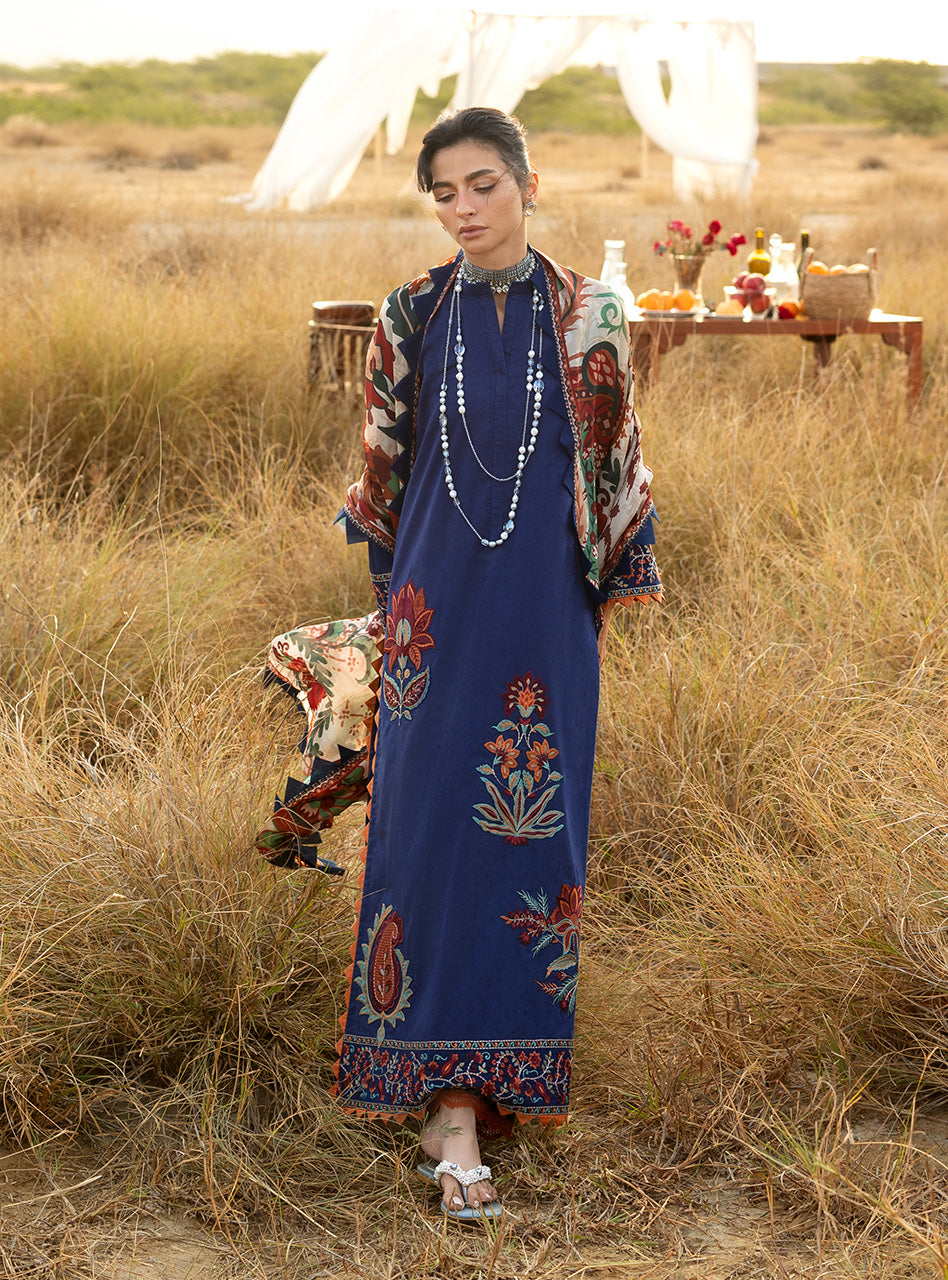 This deep navy ensemble is a celebration of rich hues and intricate detailing, designed for a refined festive statement. The shirt is adorned with ornate embroidered accents, enhanced by a striking neckline motif that adds depth and character. Paired with printed sharara pants, the look is elevated through layers of color and pattern. Completing the ensemble is a dramatic printed dupatta, draped in earthy tones and bold florals, lending an air of timeless grandeur. A perfect choice for occasions that call for elegance with a distinctive edge.