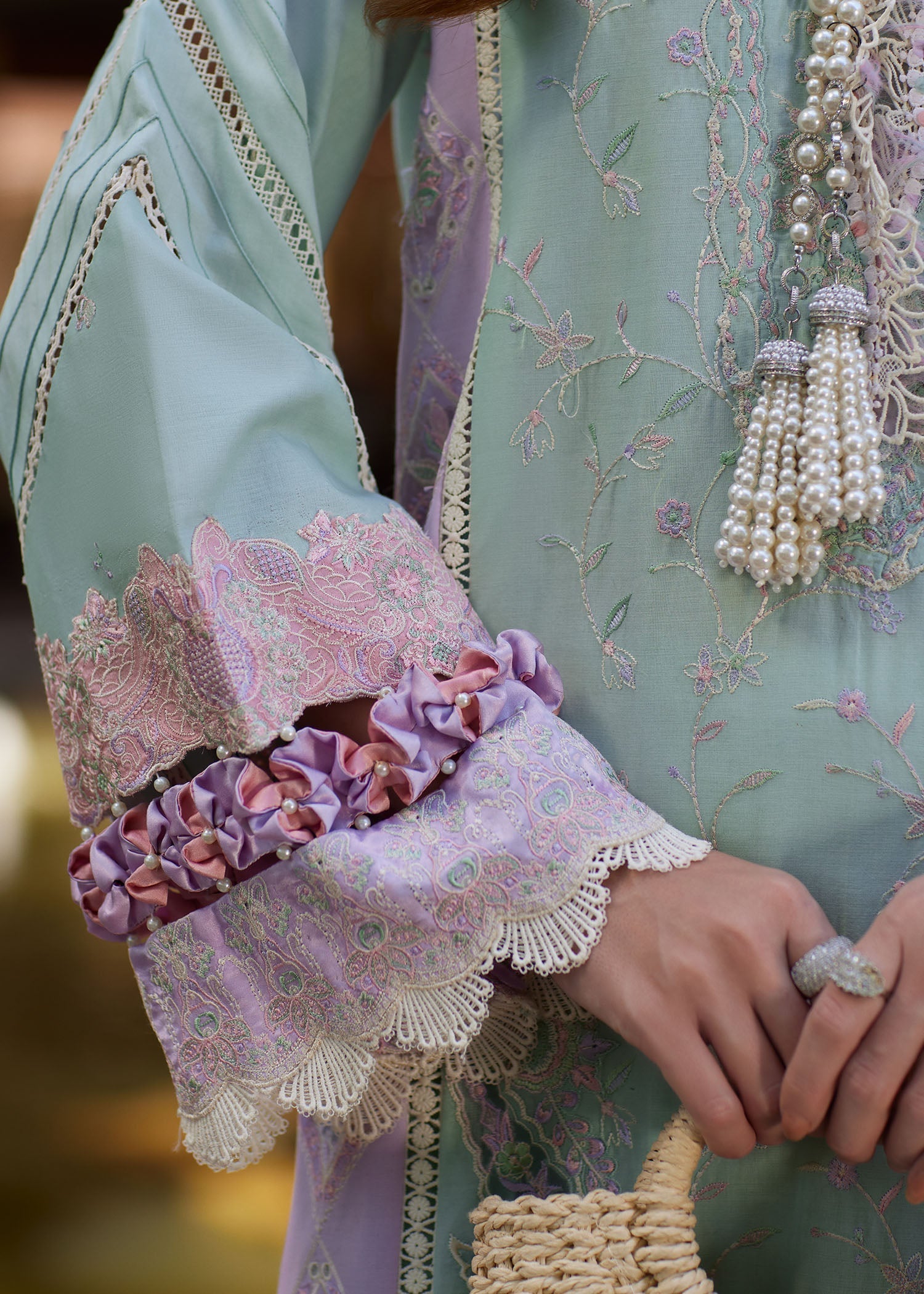 Indulge in the pinnacle of our luxury lawn series with this breathtaking mint and lilac ensemble. The shirt is a masterclass in artisanal detail, featuring delicate floral embroidery across the front and elaborate lace-trimmed sleeves that add a touch of romantic structure. It is paired with a cotton net embroidered dupatta, exuding understated luxury with its intricate patterns and airy drape. Complete with matching cambric trousers, this outfit combines subtle complexity and modern elegance for a truly regal look.