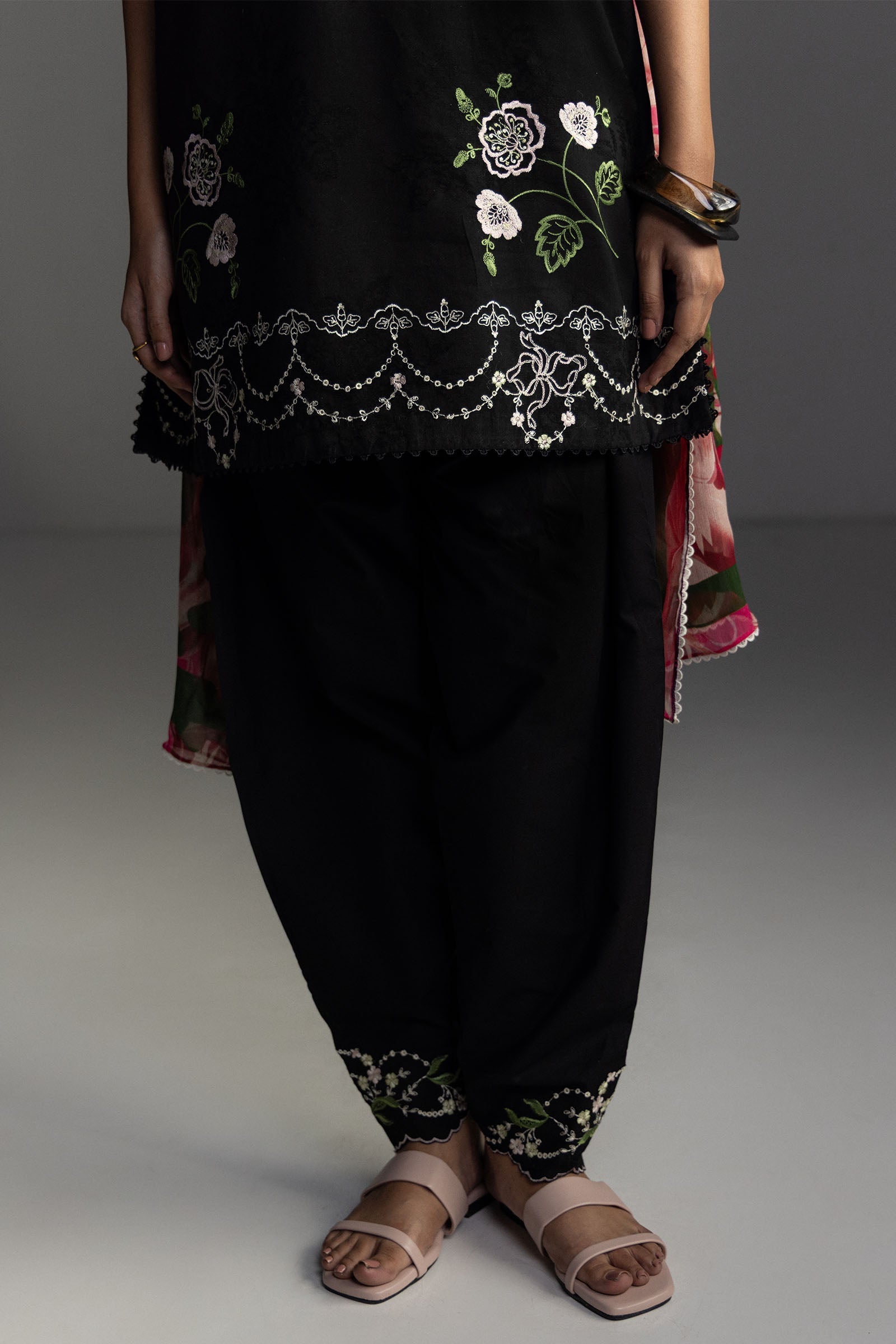 An embroidered black shirt with lace and floral inspired details, paired with a dyed black trouser, and finished with a printed hot pink and maroon dupatta for a bold yet graceful look.