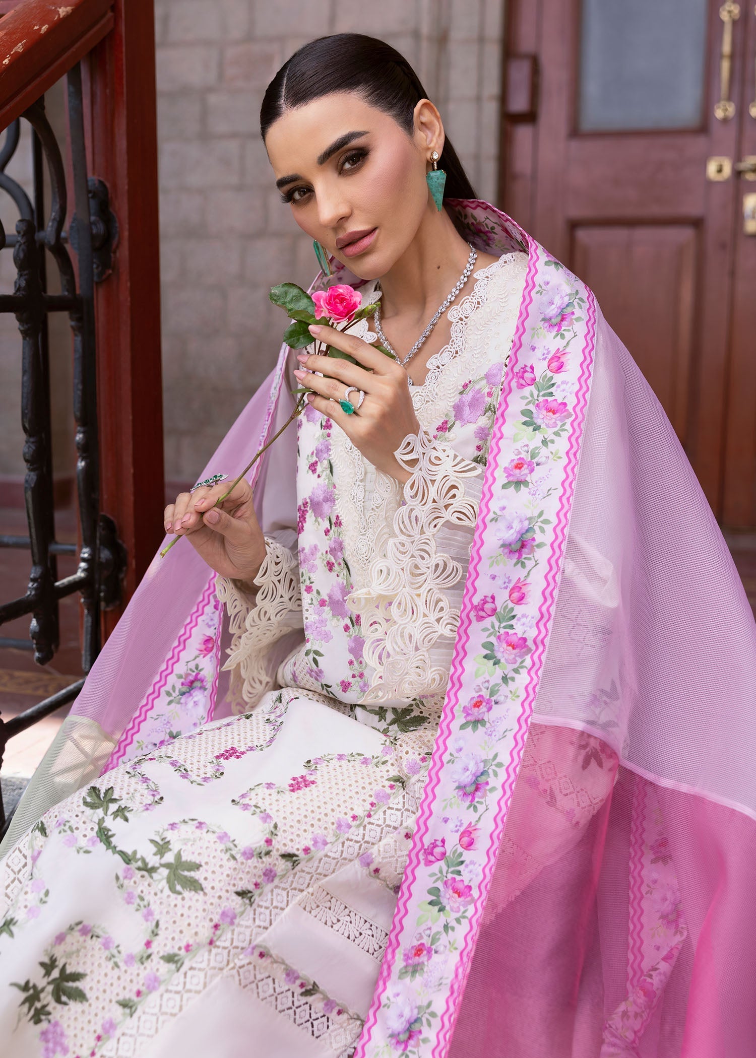 The outfit is paired with a three tone dupatta PRE-STITCHED in shades of lilac, mauve and mint finished with a silk printed border. This ensemble is a perfect symphony of statement and beauty!