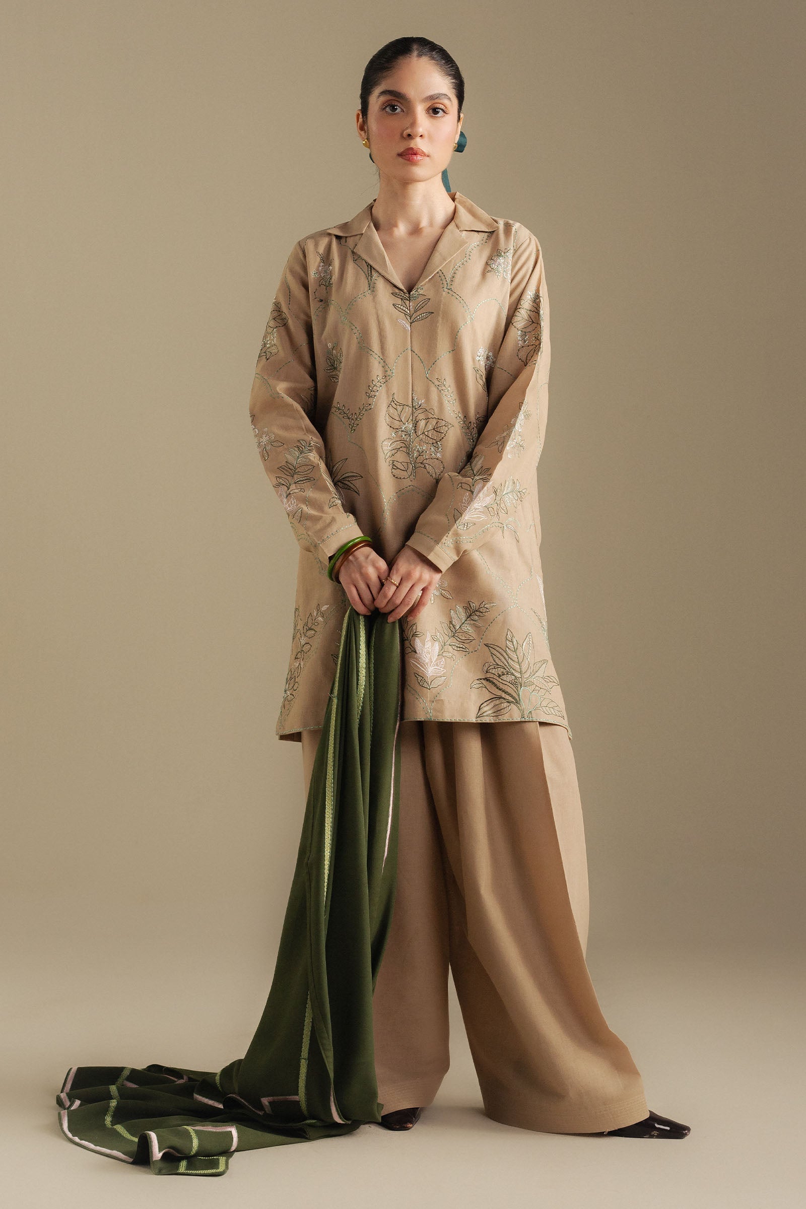 A deep mocha khaddar shirt and trouser paired with an olive green shawl, a grounded mix of warmth and ease for winter days.